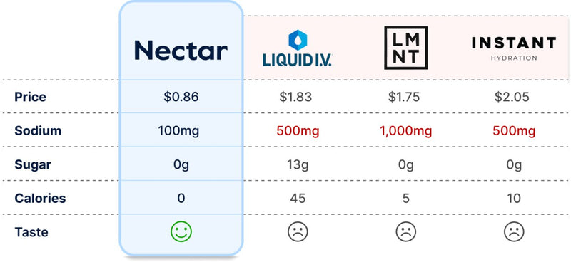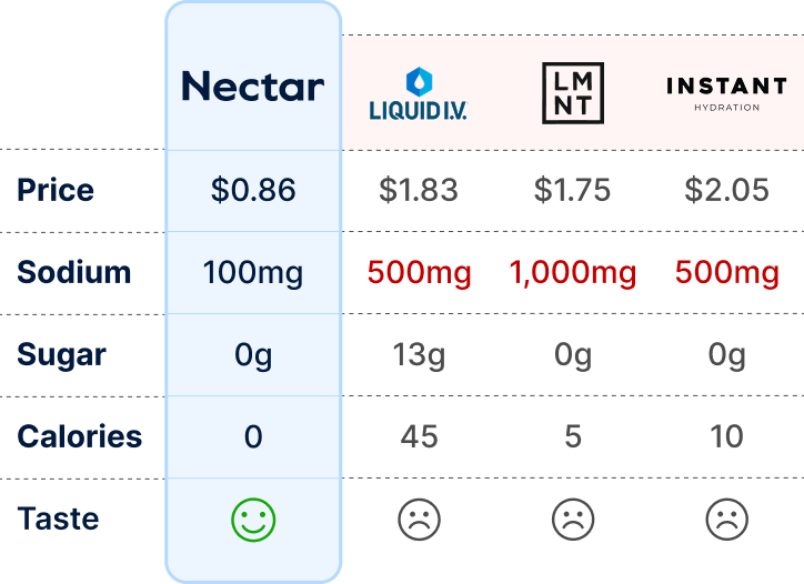 Liquid IV costs $1.50+ per serving. LMNT is $2+ per packet. Nectar delivers cleaner ingredients and better daily hydration for under $1 per serving. That's hundreds of dollars saved per year without compromising quality. Better shouldn't cost more - it just usually does.