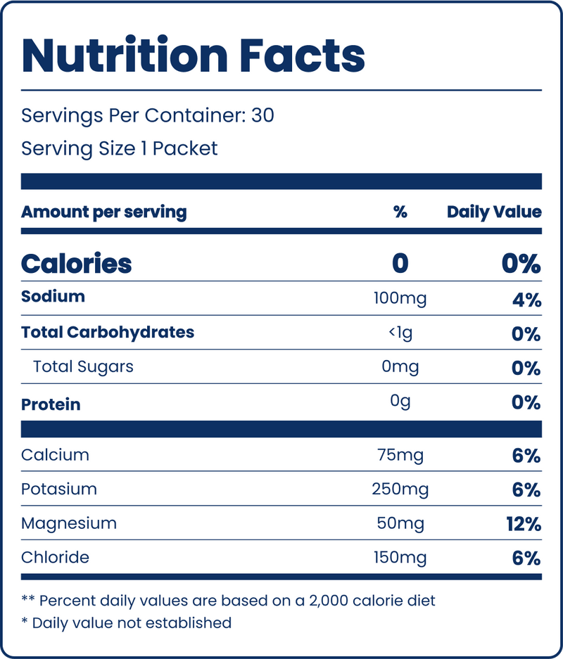 Ingredients: Organic Fruit Flavor, Pink Himalayan Sea Salt, Potassium Citrate, Magnesium Citrate, Calcium Citrate, Non-GMO Citric & Malic Acid, Organic Stevia Leaf Extract